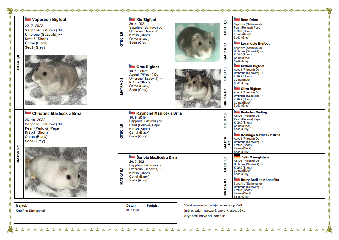 Koeficient příbuzenské plemenitby: 0,86 % (počítáno do 3. - 6. generace)
