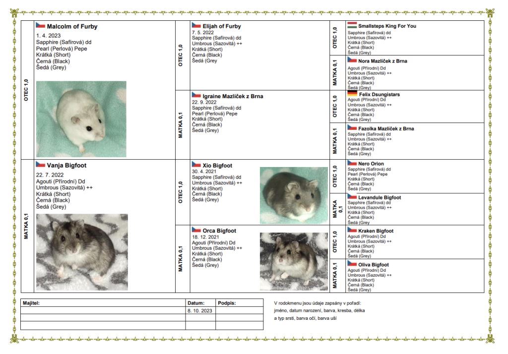 Koeficient příbuzenské plemenitby: 0,002 % (počítáno do 3. - 6. generace)